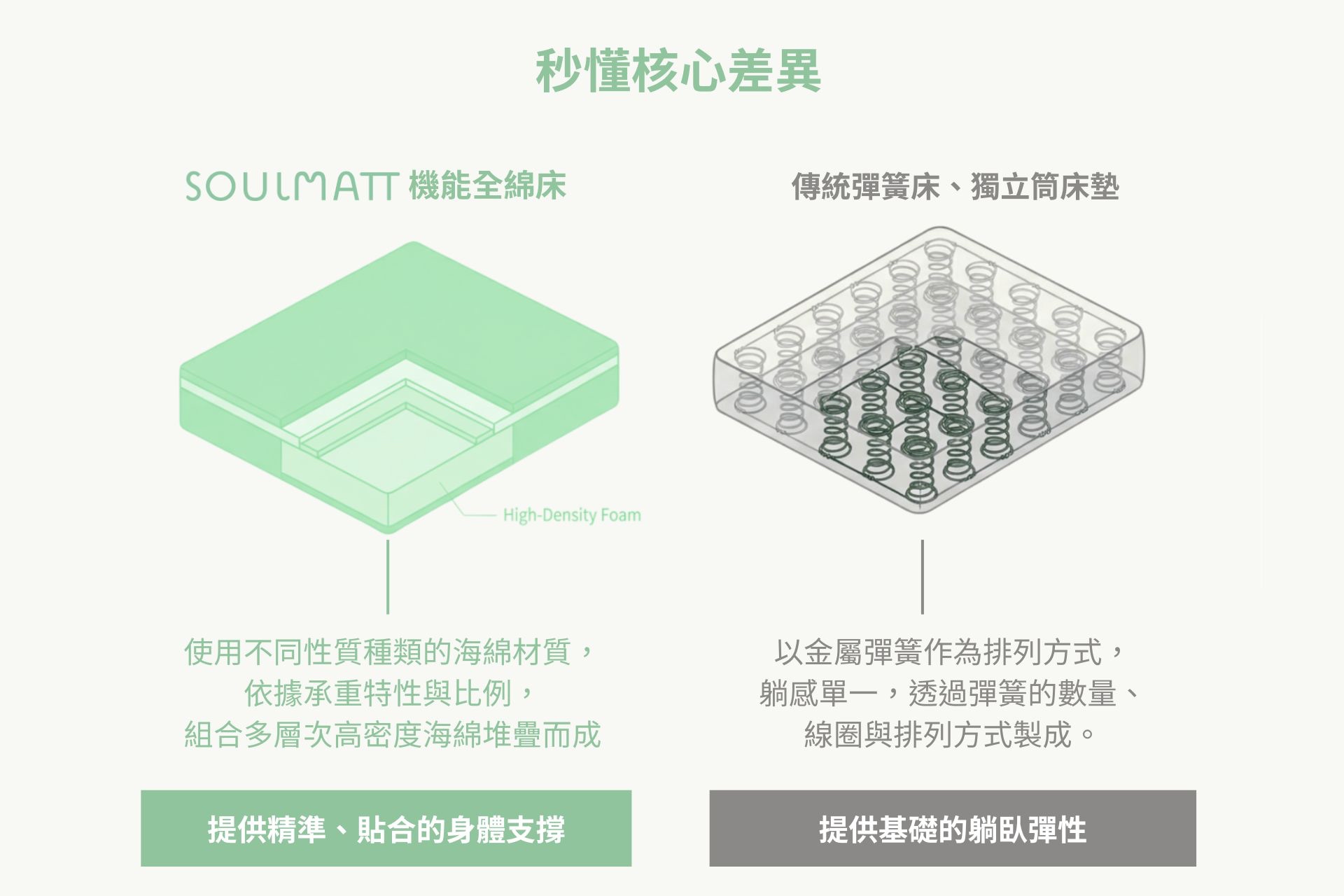 所謂的機能全綿床墊,不是一整張床都是同一個材質組成,而是經長期研發實驗,使用不同性質、不同密度,依據不同承重特性與比例,組合多層次堆疊而成, 提供透氣舒適的同時,也具有高度的防擾與支撐力,打造出歐美正流行、更符合人體工學的舒適感。 相較傳統床墊像是彈簧床、獨立筒…等,容易產生支撐單點集中、久用塌陷、翻身干擾等情況 , SOULMATT機能全綿床更專注於 ───『讓身體在睡眠中,被穩定、完整、長時間地承托』。