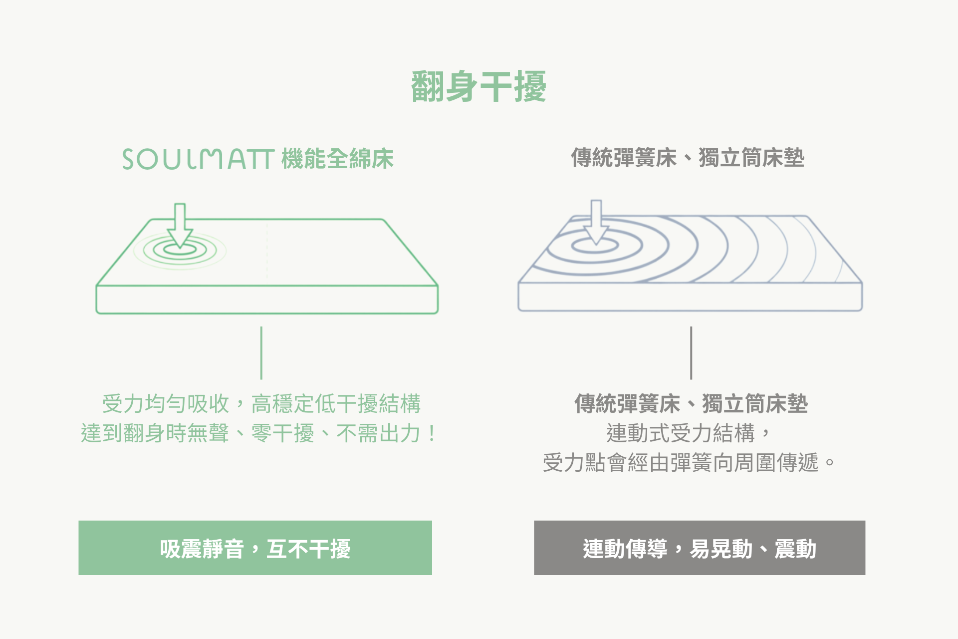 ⊛ 緩衝釋壓層:穩定吸震,承接重量變化,緩衝釋壓層是整張床的『關鍵緩衝帶』,當你翻身、側睡、起身時,重量與壓力會瞬間產生變化,如果缺乏良好的緩衝層,壓力會直接傳遞到支撐層,造成干擾與不適,SOULMATT的緩衝釋壓層,結合歐美自主減震機制的技術,透過特定密度比例設計,吸收重量變化、延緩反作用力,無需彈簧即可提供更卓越的釋壓與緩衝,是機能全綿床墊中不可或缺的黃金比例之一。